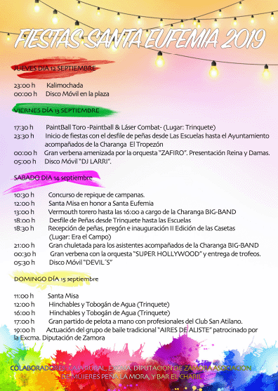 -El programa es muy variado, es un programa para todos los públicos, como suele decirse, hasta que el cuerpo aguante, con charangas, orquestas, disco móvil, para los más pequeños hinchables y para los mayores también juego de pelota y bailes regionales. Me gustaría hacer especial mención a la Orquesta Superhollywood, cuya actuación estaba prevista para el sábado 14, pero que finalmente no podrá ser tras la gran desgracia sufrida con el fallecimiento de una de sus integrantes. Desde Villaseco les enviamos mucho ánimo.