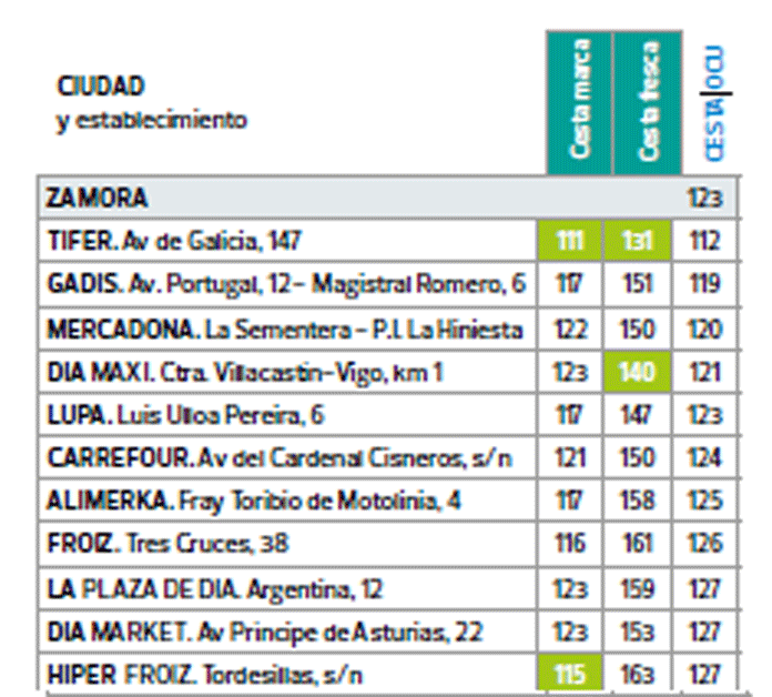 Según la información facilitada por la OCU a Noticiascyl, en Zamora, los once supermercados más baratos son, por este orden, Tifer -avenida de Galicia-, Gadis -Avda. Portugal con Magistral Romero-, Mercadona -La Sementera-, DIA Maxi -Ctra. Villacastín-Vigo-, Lupa -Luis Ulloa Pereira-, Carrefour -Cardenal Cisneros-, Alimerka -Fray Toribio de Motolinia-, Froiz -Tres Cruces-, La Plaza de DIA -Argentina-, DIA Market -Príncipe de Asturias- e Hiper Froiz -Avda. Tordesillas-.
