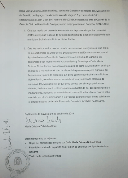El PSOE de Zamora informa hoy de que la concejala independiente del PSOE en Bermillo de Sayago, Mª Cristina Zelich Martínez, vecina de la localidad aneja de Gáname, ha presentado denuncia ante el Puesto de la Guardia Civil de la localidad contra la teniente alcalde del PP, Mª Dolores Nobre Fadón, por los presuntos delitos de injurias y abuso de autoridad por parte de la citada edil popular. Cristina Zelich relata en el escrito de denuncia cómo “el pasado día 26 de septiembre de 2019 se dio publicidad en el tablón de anuncios, que el Ayuntamiento de Bermillo de Sayago tiene en el anejo de Gáname un comunicado con membrete del Ayuntamiento y firmado por Dª Mª Dolores Nobre Fadón, como teniente alcalde de dicho Ayuntamiento, en el que explicaba a los vecinos el plan de obras  para Gáname, su financiación y plazo de ejecución".