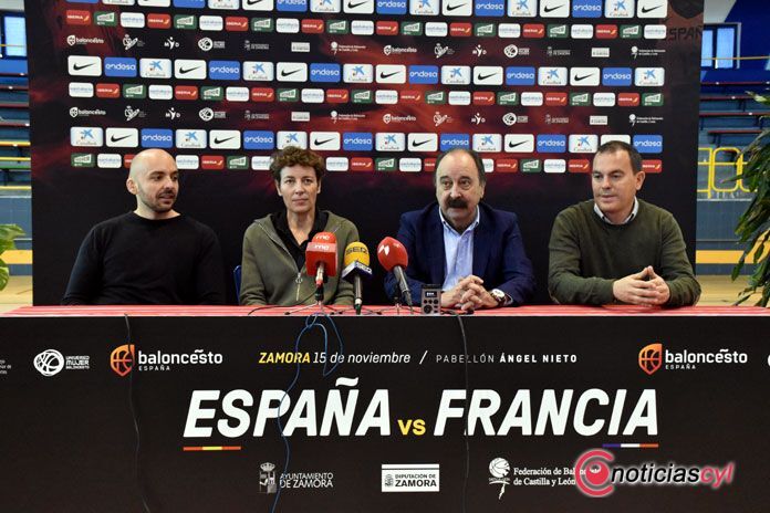 El concejal de Deportes del Ayuntamiento de Zamora, Manuel Alexander, el presidente de la Diputación, Francisco Requejo, el presidente de la Federación de Baloncesto de Castilla y León, Carlos Sainz, y la directora de Competición de la Federación Española de Baloncesto, Elisa Aguilar, han presentado esta mañana sobre la tarima del pabellón Ángel Nieto el partido amistoso entre la selección española de baloncesto femenino y la selección de Francia que tendrá lugar el próximo 15 de noviembre en la capital.