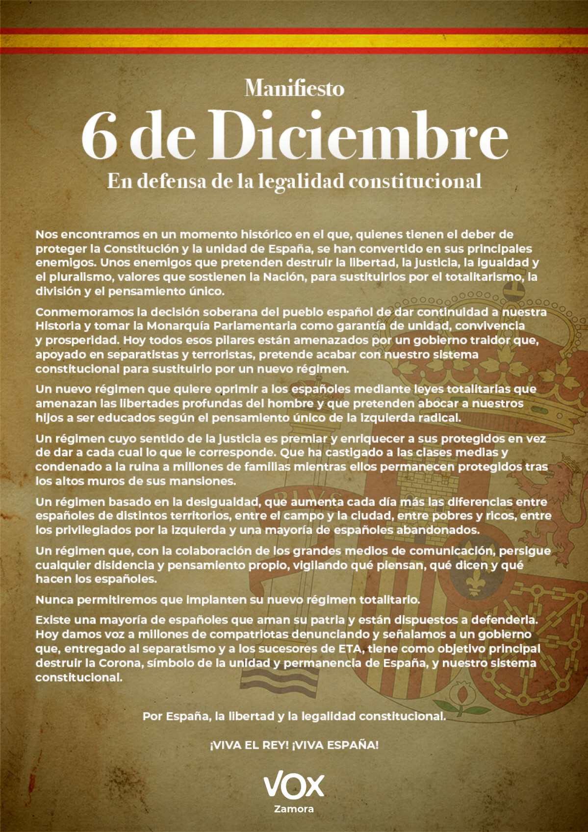 Vox Zamora ha celebrado este domingo 6 de diciembre, a las 12 horas, una concentración "en defensa" de la Constitución Española, en la Plaza Mayor de la capital. En dicho acto, los representantes de la formación política han leído un manifiesto para "defender" la legalidad constitucional "frente a los ataques del Gobierno de Pedro Sánchez, Pablo Iglesias y Arnaldo Otegi".