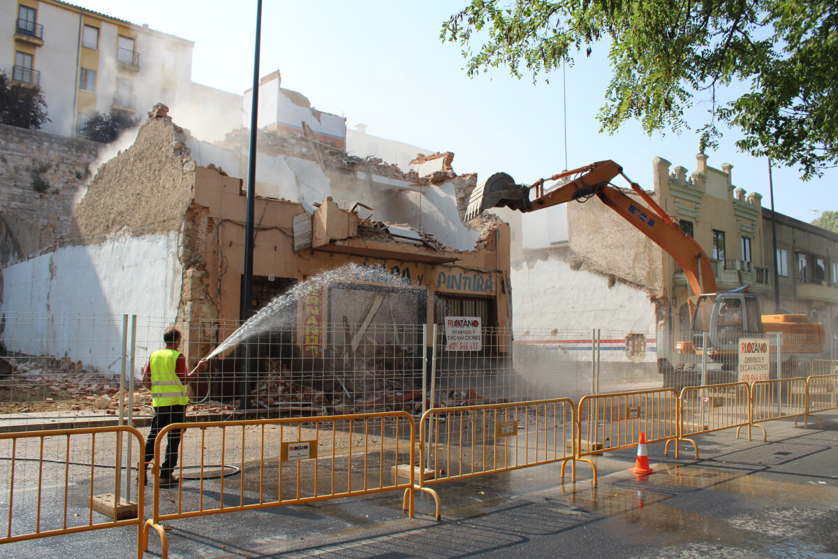 Previamente al derribo de la estructura del edificio, durante las últimas semanas se ha llevado a cabo la retirada de enseres y el levantamiento de los elementos no estructurales del interior del inmueble, que se ha realizado de forma manual. Ahora para el derribo de la estructura se ha establecido un acordonamiento perimetral como medida de seguridad para que pueda maniobrar la retroescavadora, situarse los camiones de carga de los escombros, y evitar riesgos en la caía de muros y cascotes. Para ello se ha ocupando el espacio de aparcamiento y uno de los carriles de la avenida de la Feria, en sentido de entrada a la ciudad, donde se ha delimitado además un pasillo para el tránsito alternativo de peatones.