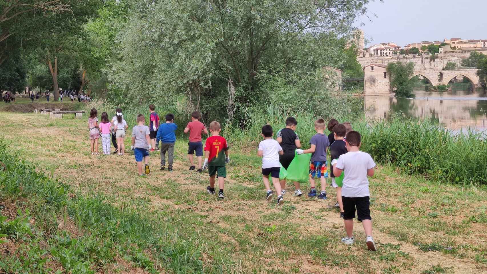 Los niños del Colegio Santísima Trinidad recogen la basura de la orilla del río Duero