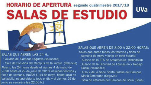 Son muchos los estudiantes que para una mayor concentración y para hincar mejor los codos se decantan por alguna de las salas de estudio existentes, por ello y para facilitar al alumnado que acudan a ellas, desde www.noticiascyl.com les acercamos los horarios.