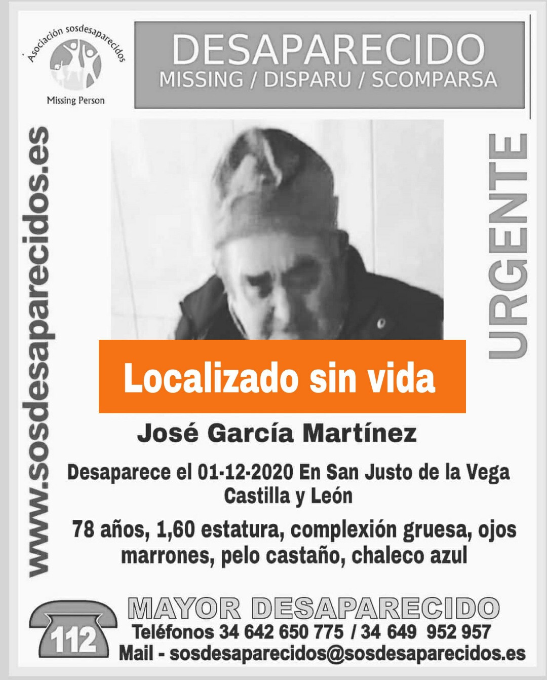 El hombre de 78 años desaparecido el martes, 1 de diciembre, en la localidad leonesa de San Justo de la Vega, ha sido localizado sin vida, como ha informado la plataforma SOS Desaparecidos.