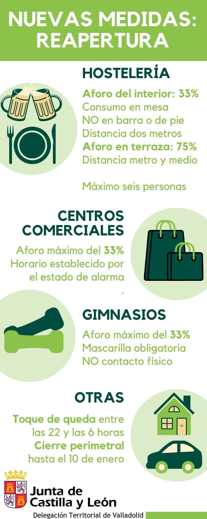 “Mañana entran en vigor estas nuevas medidas en la provincia de Valladolid relativas a la reapertura de la hostelería, los centros comerciales y los gimnasios. Se mantienen el cierre perimetral de la Comunidad y el toque de queda, que será menos restrictivo en Nochebuena y Nochevieja. No podemos relajarnos y la responsabilidad individual debe continuar imperando en los días venideros”.