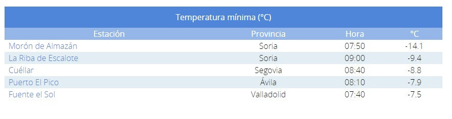 Fuente el Sol ha llegado hoy a los -7,5º, ocupando la quinta posición en lo que a temperaturas más bajas de la Comunidad se refiere. Morón de Almazán, en Soria, encabeza la clasificación con -14,1º, La Riba de Escalote, también en Soria, el segundo puesto con -9,4º, Cuéllar, en Segovia, con -8,8º y Puerto el Pico, en Ávila, con -7,9º.