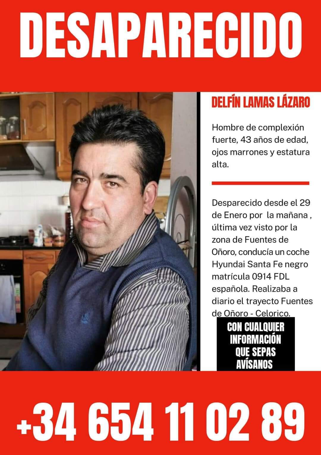 Delfín tenía 43 años y era un hombre de complexión fuerte que había sido visto por última vez este viernes por la mañana a bordo de su Hyundai Santa Fe de color negro, según rezaba la información que está circulando por Internet.