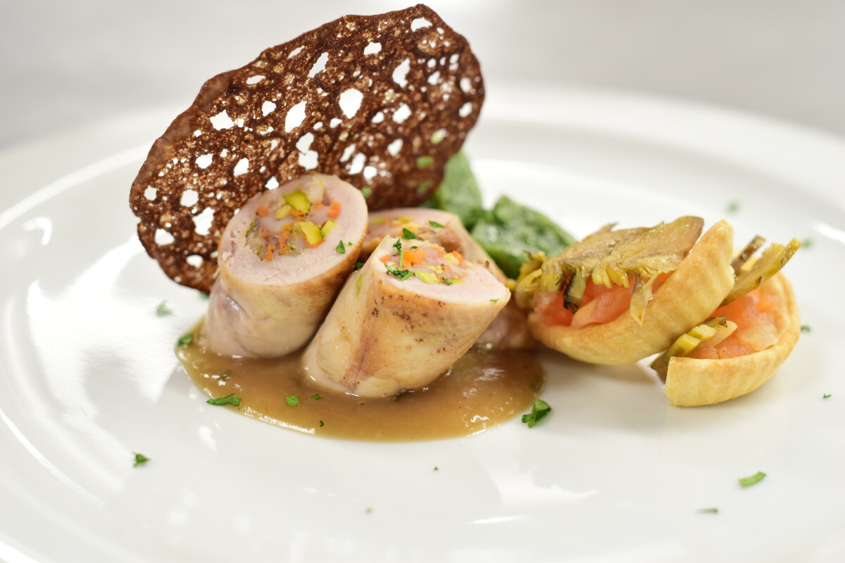 R. Me presenté con una Ballotine de pechuga de codorniz rellena de verduras, con una guarnición de ñoquis de espinacas y una tartaleta de tomate y alcachofas.
