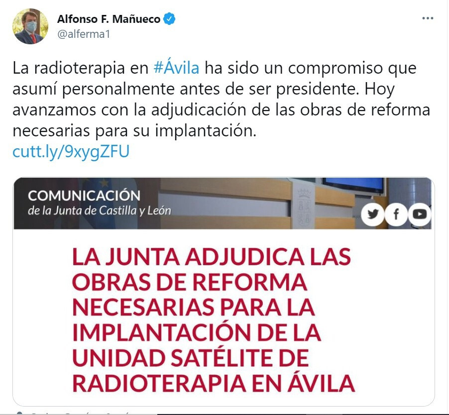 "La radioterapia en Ávila ha sido un compromiso que asumí personalmente antes de ser presidente. Hoy avanzamos con la adjudicación de las obras de reforma necesarias para su implantación", reza su tuit.