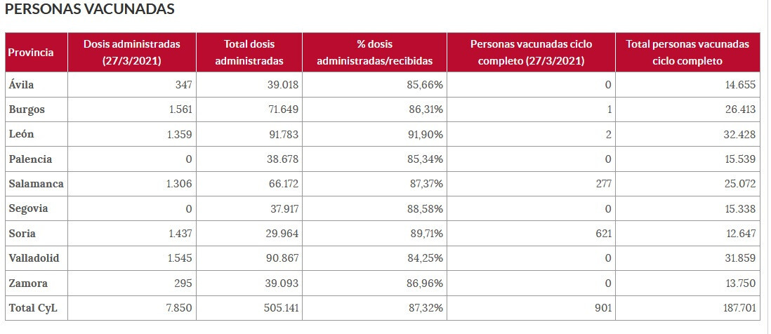 Estas cifras contrastan con las dosis inoculadas a las personas mayores de 80 años, que son en Soria (92%), Segovia (88%), Ávila (73%), Burgos (66%), León (43%), Zamora (51% y, la última, Salamanca (34%).