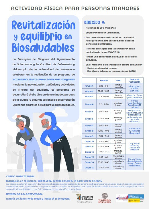 El Ayuntamiento de Salamanca y la Facultad de Enfermería y Fisioterapia de la Universidad de Salamanca han impulsado un nuevo programa de actividad física para las personas mayores mediante propuestas que favorecen la revitalización geriátrica y la mejora del equilibrio.