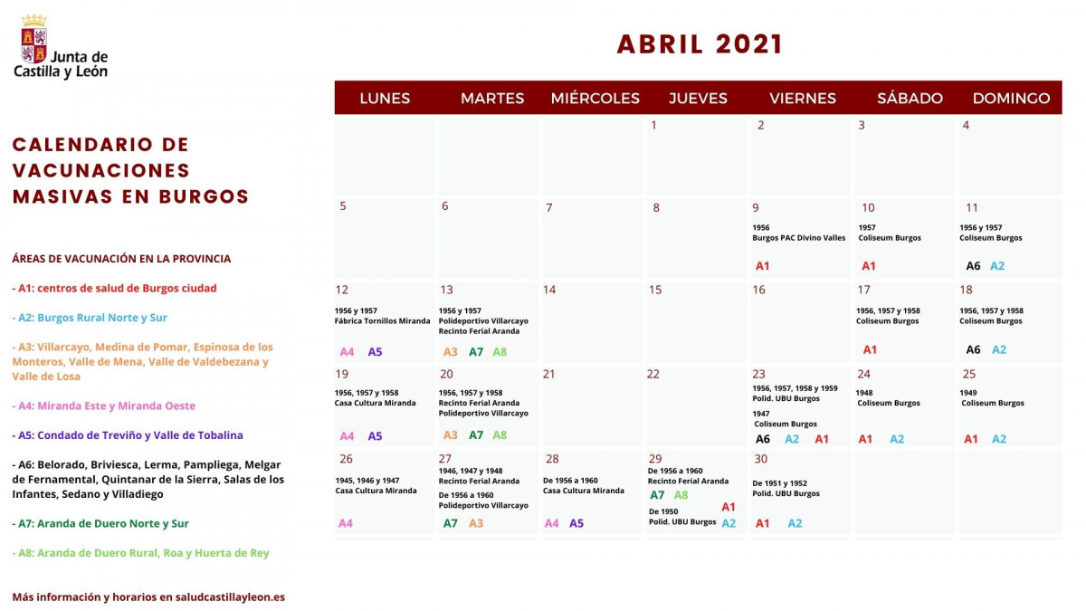 El viernes 30 de abril sigue la inoculación el en mismo polideportivo universitario a las personas nacidas en 1951 y 1952, que tienen 69 y 70 años. Esta citación está dirigida a las personas pertenecientes a las zonas básicas de salud de Burgos capital y de Burgos Rural Norte y Burgos Rural Sur. El horario preestablecido para ese día es: