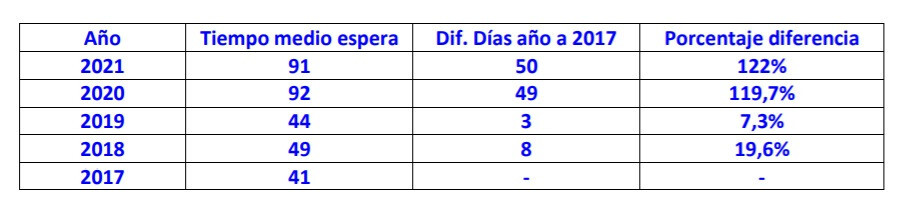 Llama la atención la subida de la demora la lista de espera quirúrgica en Traumatología que en Marzo de 2017 era de 68 días y en Marzo de 2021 es de 184. Una diferencia de 116 días más y un incremento porcentual del 170,096%.