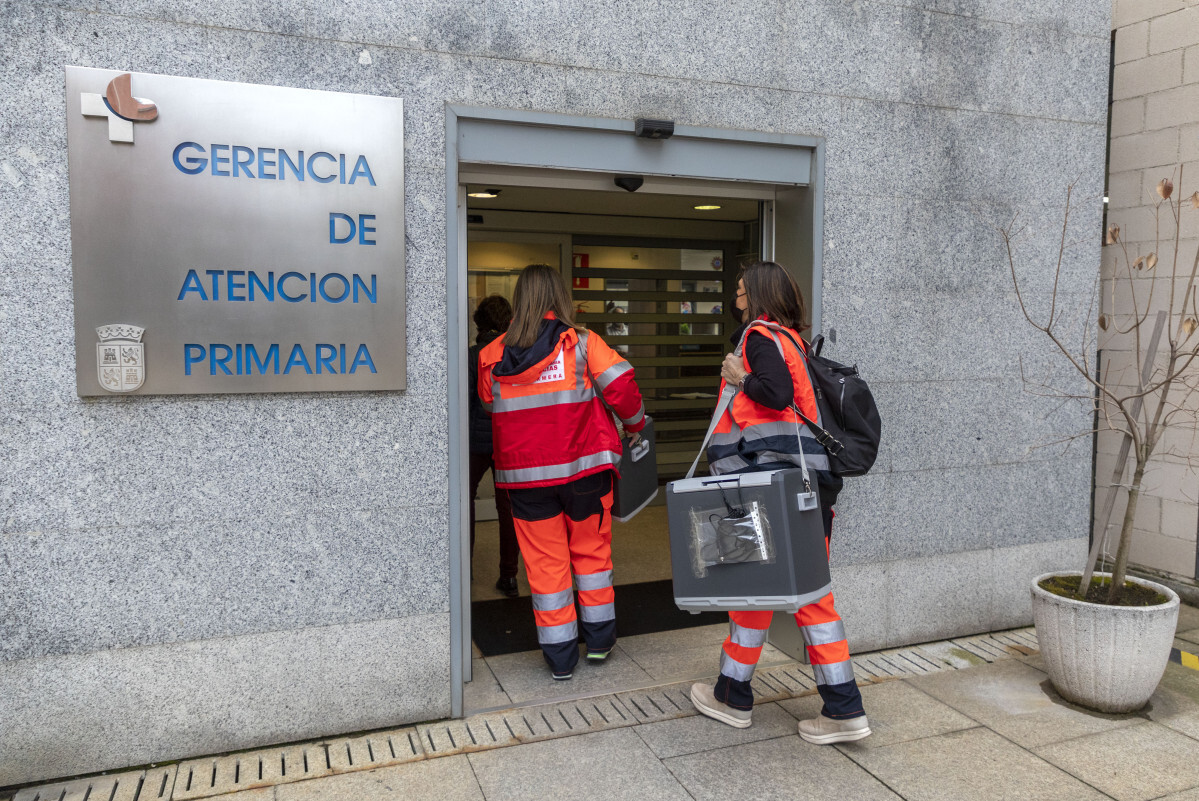 De nuevo al volante, callejean por el corazón de la capital del Tormes hasta alcanzar la Gerencia de Atención Primaria en la calle Arapiles. Sortean las colas de pacientes que ya aguardan sus citas respetando escrupulosamente la distancia de seguridad en el patio interior del Centro de Salud Miguel Armijo y meten todas la vacunas en el edificio. Allí reparten las dosis precisas en función del destino. Los distintos equipos de enfermería, debidamente formados para seguir al pie de la letra los estrictos protocolos de cada marca, se hacen cargo de sus viales correspondientes. Aparte de la sustancia, reservada en envases protegidos para su transporte, también llevan otro tipo de material, como jeringas y agujas, del que no disponen los pabellones.