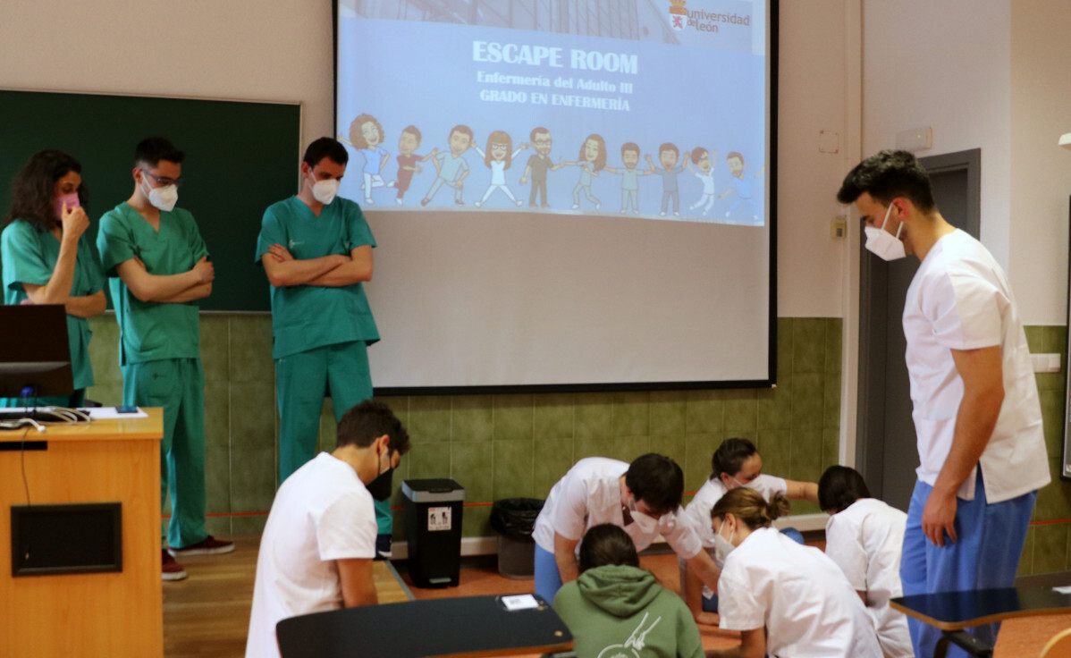 Un total de 103 estudiantes de Grado de Enfermería han asistido durante tres días, en sesiones de dos horas, a un singular Escape Room sobre cuidados de enfermería en distintas áreas sanitarias. La idea partió del Departamento de Enfermería y Fisioterapia, a través de la profesora Ana Isabel López, en colaboración con un grupo de docentes asociados al departamento que desarrollan su labor profesional en el Hospital de León y en Centros de Salud de Atención Primaria.