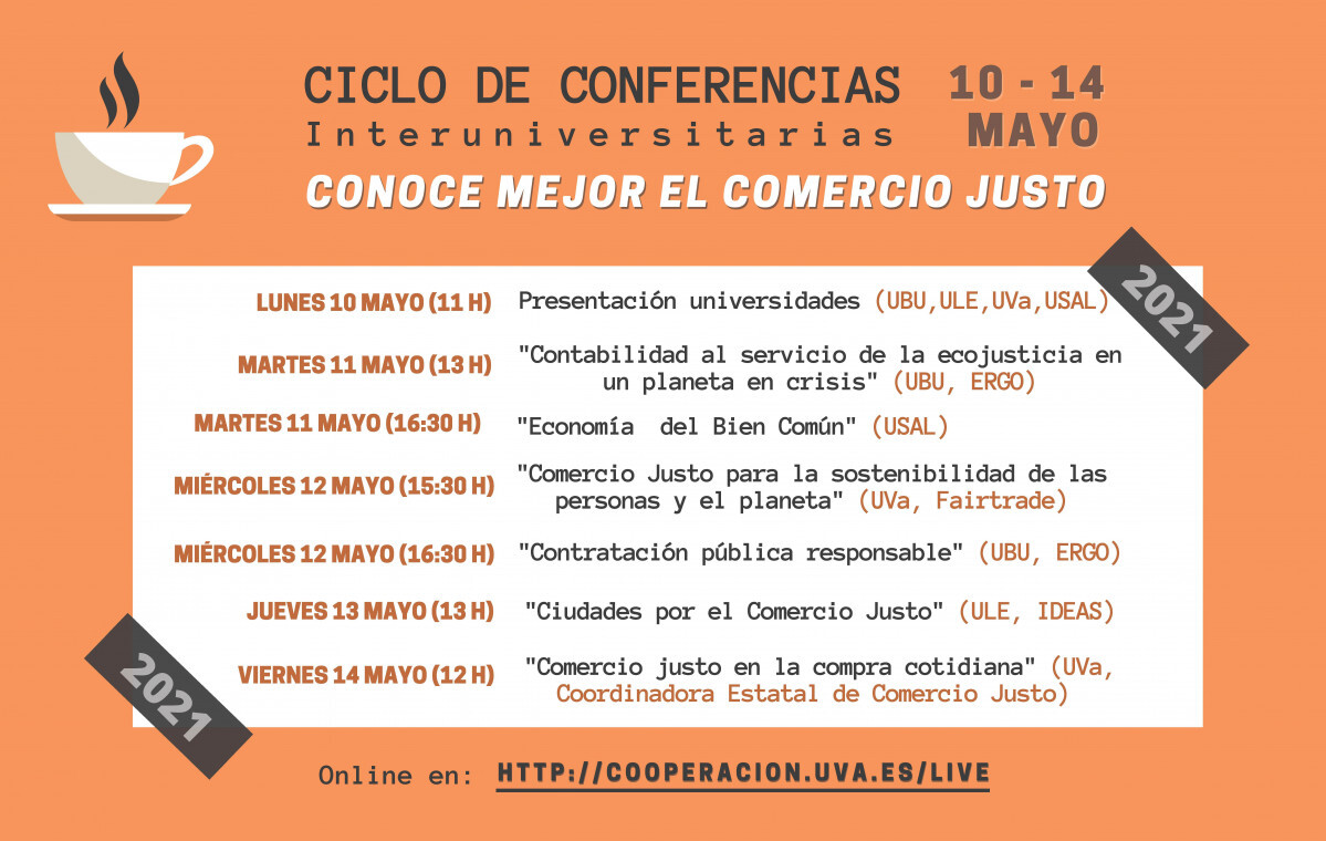 Atendiendo a esas premisas, la próxima semana se desarrollará un ciclo interuniversitario de conferencias online que comenzará el lunes a las 11:00 horas con la presentación de los servicios de las cuatro universidades públicas encargados de promover iniciativas por el Comercio Justo. En el caso de la ULE, estará presente la Oficina Verde del Vicerrectorado de Infraestructuras y Sostenibilidad. Todas las ponencias se celebrarán online y se podrán seguir a través del siguiente enlace: