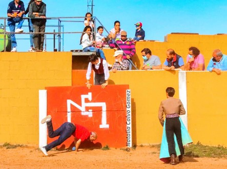 Pero a la tercera fue la vencida, y a Gregorio no le dio tiempo a salir escapado, aunque lo intentó emulando a los toreros cuando “cogen el olivo” y, aunque a cámara lenta, salvó la barrera, pero acabó con un costalazo en el albero de la plaza de tientas. Oportuno momento que recogió nuestra gráfica Natalia Calvo.