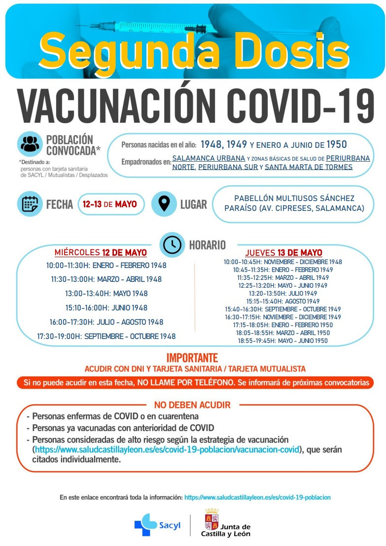 La vacunación continúa en la provincia de Salamanca. En la capital llega el turno para la segunda dosis a los nacidos en 1948, 1949 y hasta junio de 1950. Será el miércoles 12 y el jueves 13 de mayo, en el Pabellón Multiusos Sánchez Paraíso de Salamanca, para las zonas de salud Salamanca Urbana, Periurbana Norte, Periurbana Sur y Santa Marta de Tormes