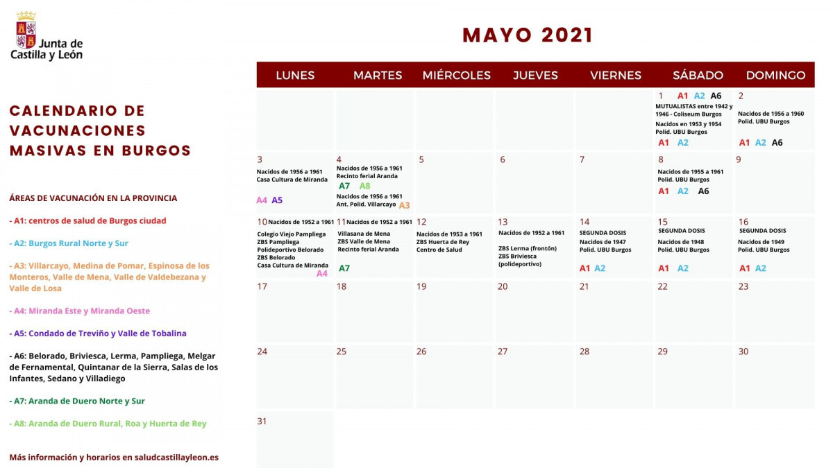 El domingo 15 de mayo comienzan las vacunaciones masivas de las segundas dosis en el polideportivo universitario a los empadronados en la capital y a las personas pertenecientes a las zonas básicas de salud de Burgos Rural Norte y Burgos Rural Sur. Este día se inoculará a las personas de 72 años, nacidos en 1949. El horario de las vacunaciones será de 9 de la mañana a 15 horas. Los asistentes deberán acudir respetando los horarios establecidos para cada mes de nacimiento: