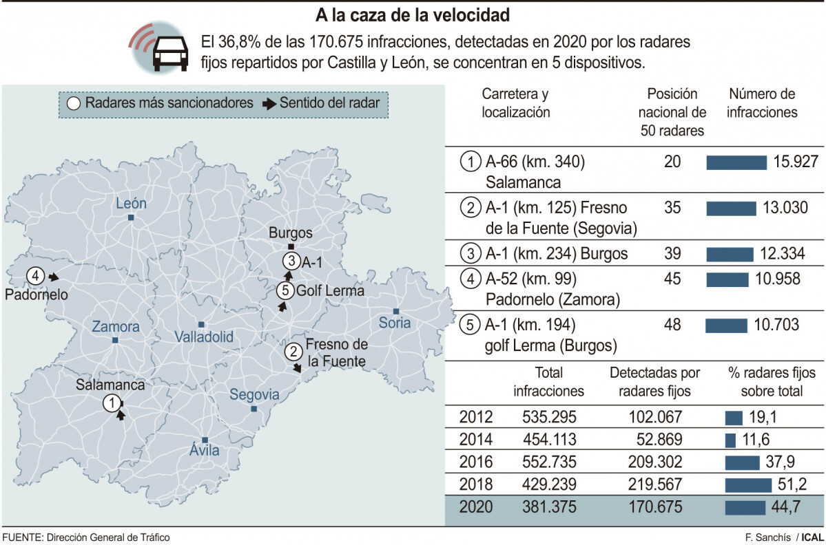 El pasado año, cuando el tráfico estuvo por una drástica reducción de la circulación provocada por el confinamiento y el estado de alerta, que en el caso de las carreteras de Castilla y León se tradujo en una caída de los desplazamientos de largo recorrido del 26 por ciento, descenso que los fines de semana alcanzó el 37,1 por ciento, los radares fijos de la DGT tramitaron 170.676 multas, lo que representa el 44,7 por ciento del total de infracciones, que alcanzaron las 381.376. Este porcentaje desciende ligeramente con respecto a los últimos dos años, cuando las multas de los radares suponían la mitad de todas las sanciones en carretera.