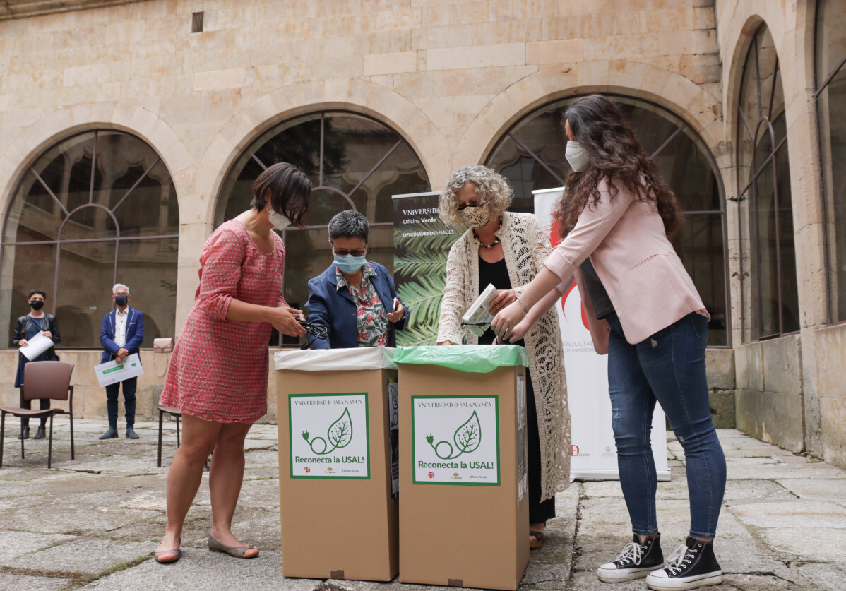 La Universidad de Salamanca ha presentado esta mañana un proyecto de economía circular, coordinado por la Oficina Verde, que fomenta el reciclaje de dispositivos eléctricos y electrónicos. “Reconecta la USAL”, surgido de la iniciativa de la Clínica Jurídica de Acción Social, se pone en marcha este mes de junio en 25 centros de todos los campus de la Universidad de Salamanca para que el personal docente e investigador, estudiantes y personal de administración y servicios puedan depositar pequeños dispositivos eléctricos y electrónicos (como móviles, tablets, secadores de pelo y cargadores) en los 28 puntos de recogida. A partir de ese momento, la empresa Porsiete, especializada en gestión de residuos, se encargará de su clasificación, valoración y tratamiento, que permitirán su reparación, desmontaje o gestión de sus componentes, en función de su grado de reaprovechamiento.