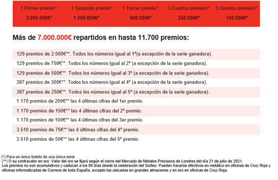 El boleto del Sorteo de Oro puede resultar agraciado con unprimer premio de 3 millones de euros (*) o un segundo de 1.000.000€ (*) o un tercero de 500.000€ (*). Tres cuartos premios de 250.000€ (*) y tres quintos premios de 100.000€ (*). Éstos se sumanacientos de menor cuantía, lo que hace un total de 11.700 premios por un valor de más de 7.000.000€.