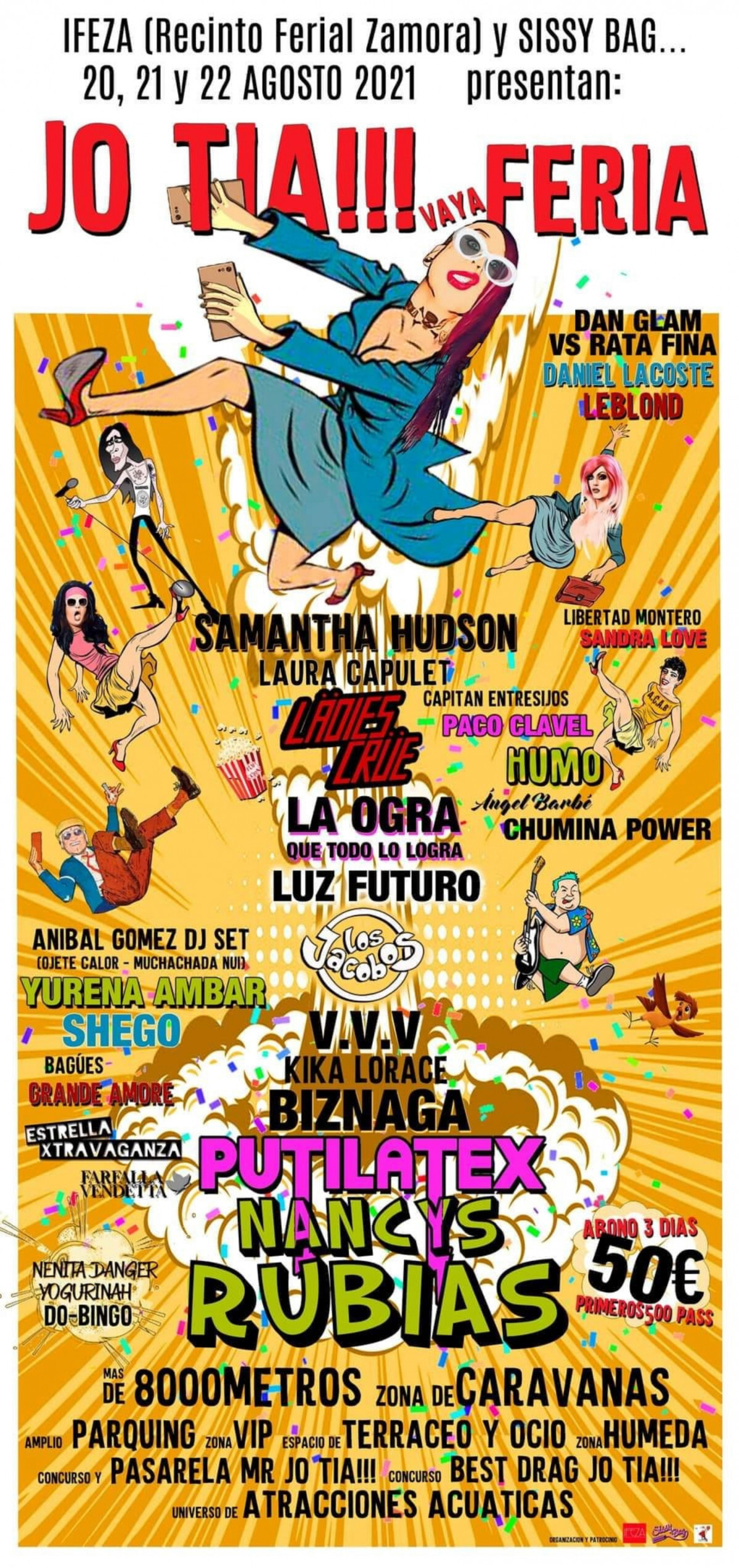 Las Nancys Rubias, Putilatex, Kika Lorace o Samantha Hudson aterrizarán en Zamora el 20, 21 y 22 de agosto en el recinto ferial de Ifeza, en la Feria '¡Jo, tía, vaya feria!'. Una apuesta del recinto ferial y Sissy Bag para celebrar un festival de música y ocio en los 8.000 metros de Ifeza con algunos de los artistas más trasgresores de la escena musical LGTBI de España.