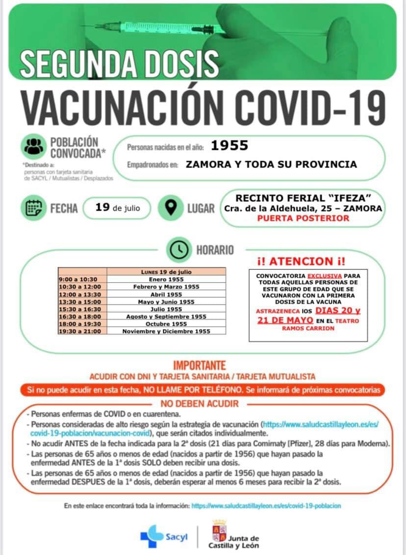 La Gerencia de Salud en Zamora ha anunciado hoy que la próxima semana se pondrán las segundas dosis de AstraZeneca para los nacidos 1955, el 19 julio en Zamora (Ifeza) y 23 julio en Benavente (Centro de Negocios), lo que supone un adelanto de cuatro semanas con respecto a la fecha prevista inicialmente.