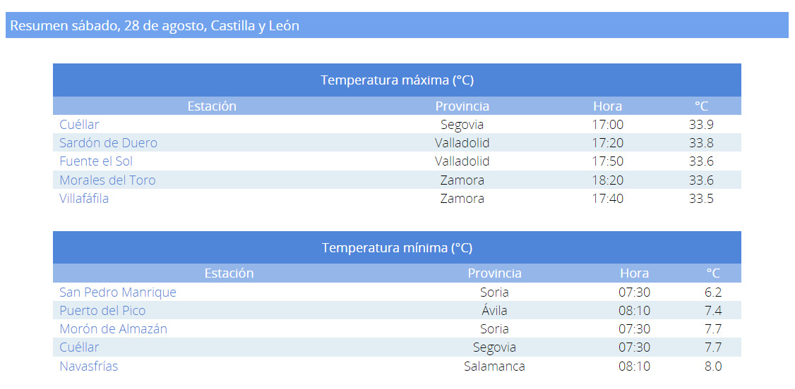 En un sábado, el del 28 de agosto, que volvió a ser caluroso en Castilla y León, Cuéllar marcó la temperatura máxima de la Comunidad, según los datos de la Agencia Estatal de Meteorología consultados por El Español Noticias de Castilla y León, llegando a los 33.9º a las 17.00 de la tarde.