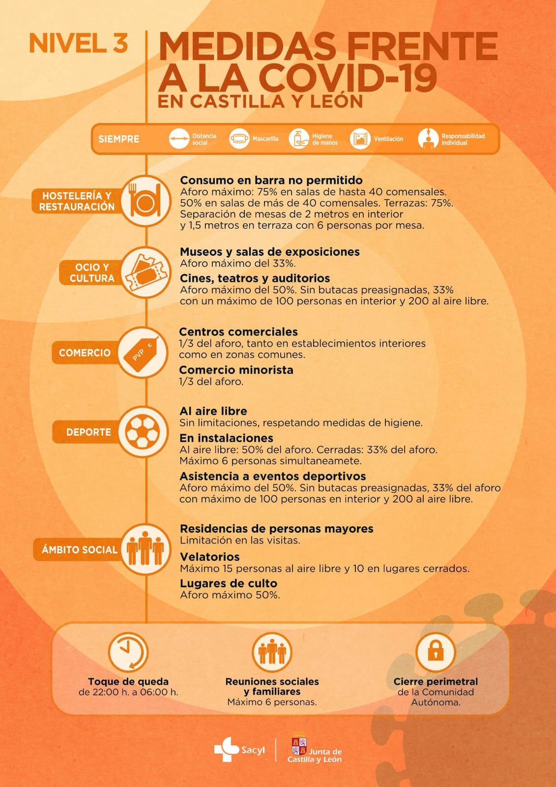 En todo caso es importante recordar que se mantienen en plena vigencia otros mandatos de ámbito individual, tales como el toque de queda entre las diez de la noche y las seis de la mañana, el uso obligatorio de mascarillas, la limitación de las reuniones familiares y sociales a un máximo de seis personas, la distancia interpersonal de seguridad y los cierres perimetrales de la Comunidad y de territorios concretos castellanos y leoneses.