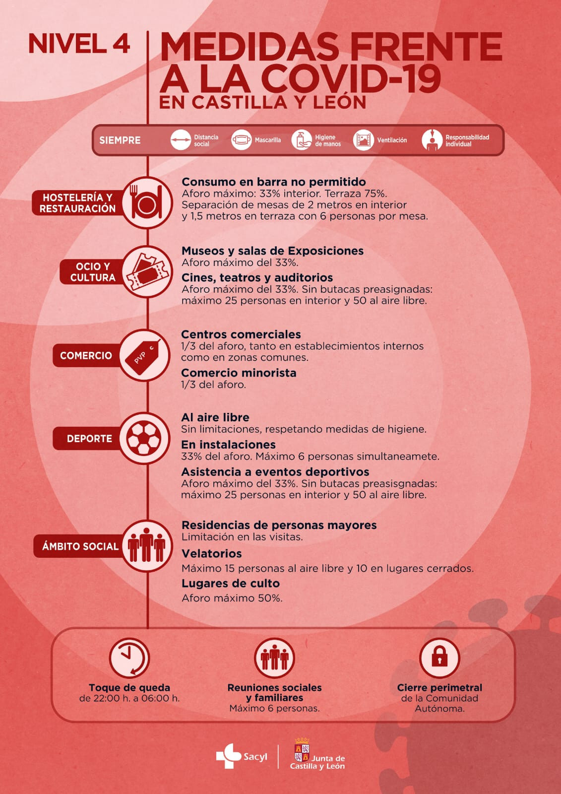 En todo caso y en relación con éstas y otras regulaciones debidas a la evolución epidemiológica, asistencia, social, económica, de la movilidad, etc., de la pandemia en la Comunidad, tiene una enorme relevancia recordar que se mantienen en plena vigencia otros mandatos de ámbito individual, tales como el toque de queda entre las diez de la noche y las seis de la mañana, el uso obligatorio de mascarillas, la limitación de las reuniones familiares y sociales a un máximo de seis personas, la distancia interpersonal de seguridad y los cierres perimetrales de la Comunidad y en territorios provinciales concretos castellanos y leoneses.