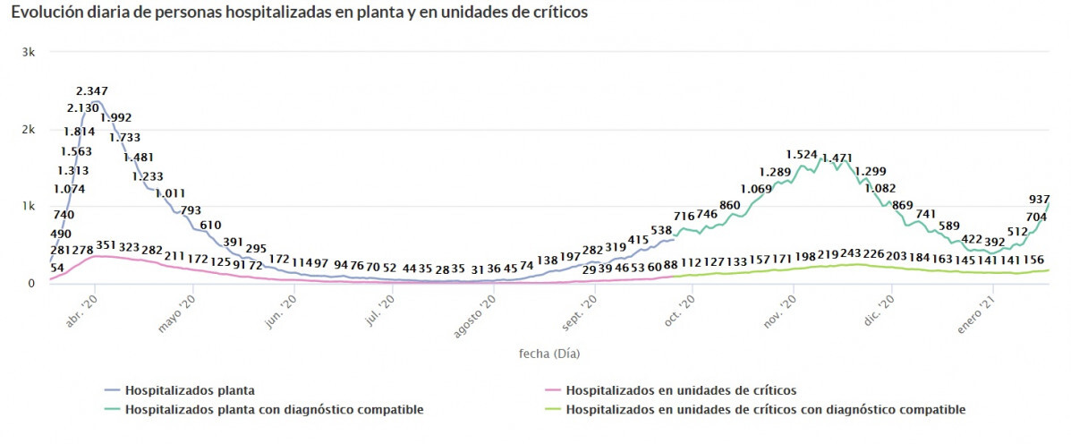 Y es que, si cabe, los datos que no engañan son los de los hospitales. Desde el 31 de diciembre, fecha en la que los ingresados seguían bajando, hasta el 18 de enero, los enfermos por Covid se han triplicado en los más de diez hospitales de la comunidad.