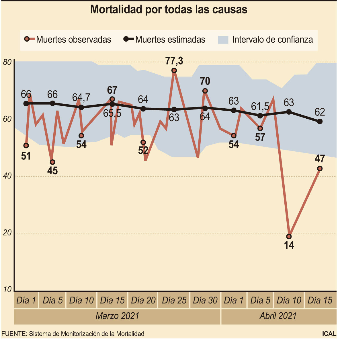 Si se analiza el grupo de mayores de 74 años, donde está incluida buena parte de las personas que viven en residencias y que fueron los primeros en inmunizare, a los que se han ido uniendo los mayores de 80, los datos son más reveladores. En estos 13 días de abril murieron 211 personas menos de las estimadas, es decir, 420 frente a 631, lo que supone que no hubo exceso de mortalidad, todo lo contrario, falleció un 33 por ciento menos de la gente prevista en esta franja de edad. De hecho, todas las jornadas anotaron menores decesos de los calculados, con la excepción de los días 2 y 7, cuando hubo 51 y 59, para 49 y 48 muertes previstas.