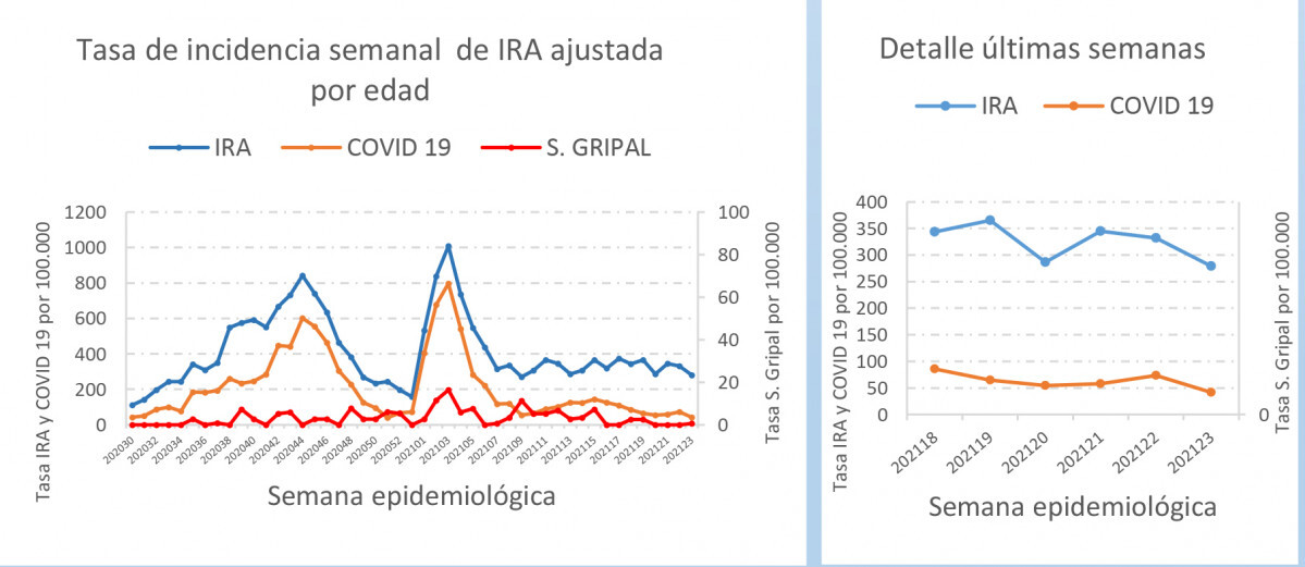 La Red Centinela VIGIRA la forman 58 unidades/cupos de médicos de familia, pediatras y enfermeras, que cubren una población en torno a 50.000 tarjetas sanitarias (17.000 <15 años y 33.000 >=15 años). Los procesos clínicos de IRA se recogen semanalmente de la base de datos de MEDORA y se procesan por semana y código de la CIE-10. Las tasas por COVID 19 solo recogen los procesos clínicos con infección respiratoria en atención primaria. Se calculan tasas de incidencia semanal ajustadas por edad y acumuladas desde la semana 2020/30. Se actualizan los datos retrospectivos semanalmente.