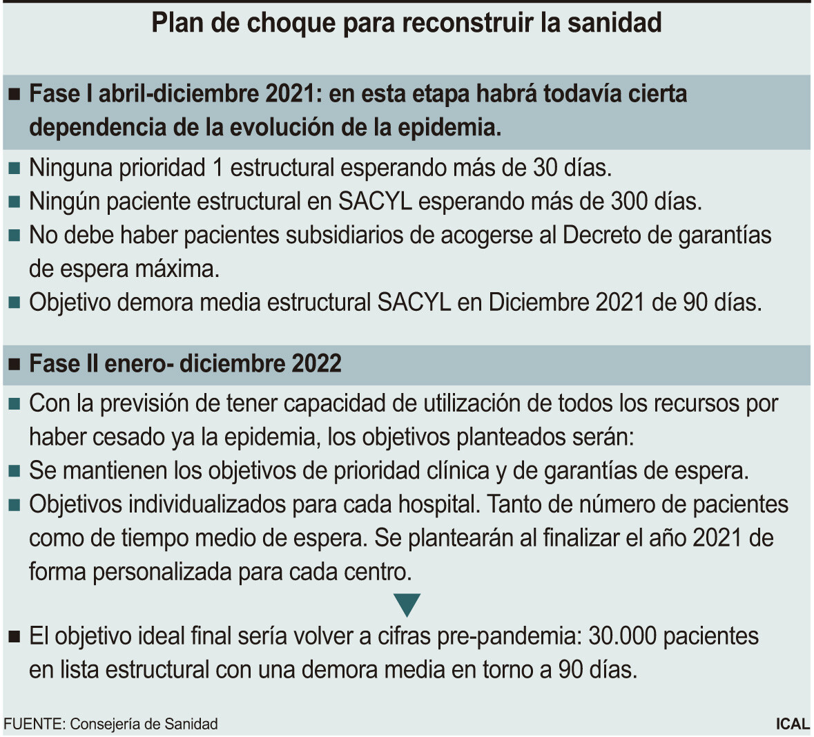El plan, que arrancó en abril, tiene dos fases. La primera concluirá en diciembre, siempre que “no haya nada que lo ponga del revés”, como una nueva ola. A finales de año, la previsión es que ningún paciente en prioridad 1 estructural, los más graves, espere más de 30 días para ser intervenido; ninguno en lista estructural, por el motivo que sea, esté más de 300 días, y no haya ningún paciente subsidiario de acogerse al Decreto de garantías de espera máxima, que le permitiría elegir el centro donde ser intervenido.