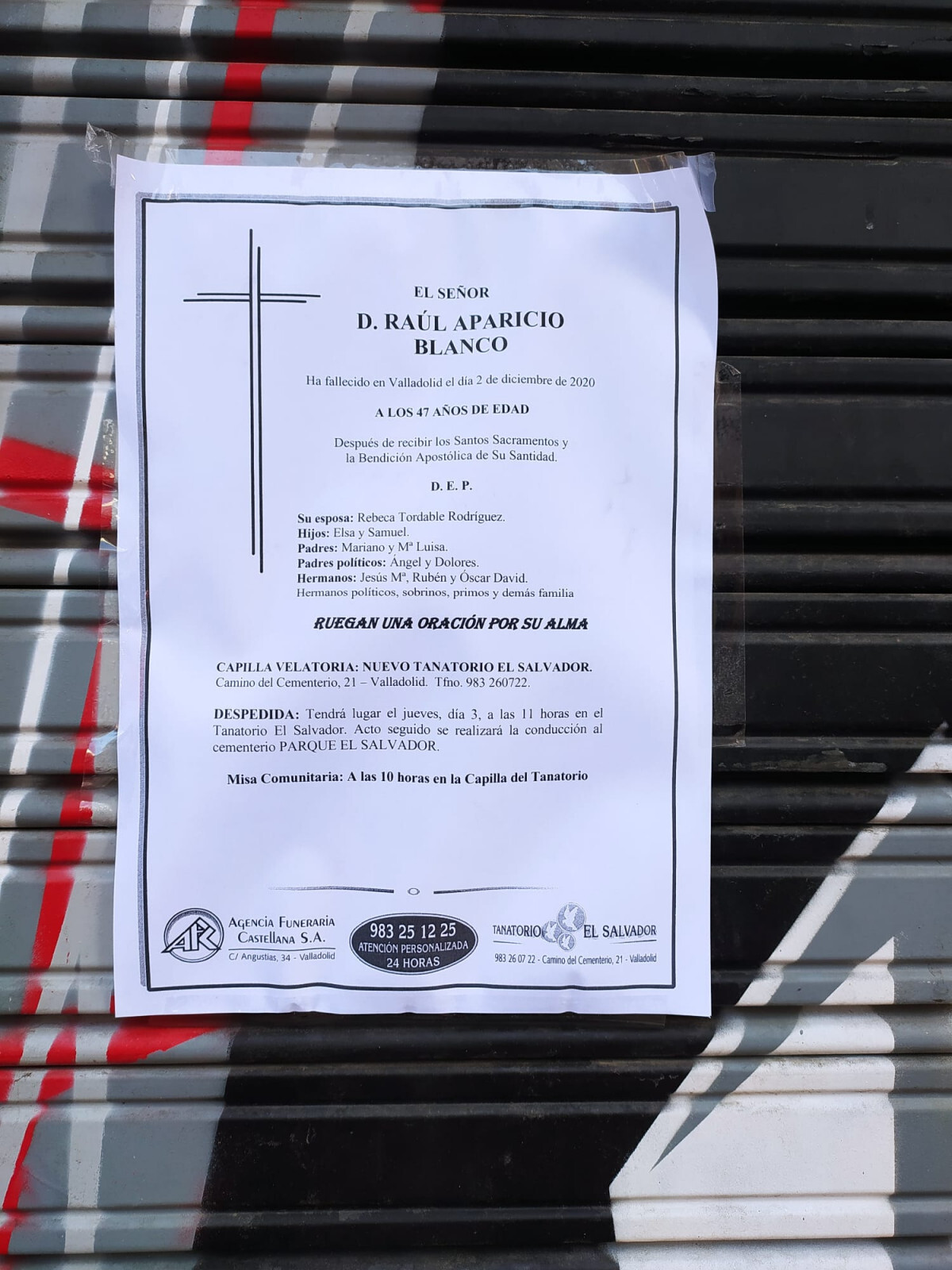 Conmoción en el sector hostelero de  Valladolid. La presidenta de la Asociación Provincial de Hostelería de Valladolid, María José Hernández, ha confirmado a este periódico que el pasado martes, a eso de las 22.00 horas, se encontró el cuerpo sin vida de Raúl Aparicio, el dueño del Bar Las Torres en su establecimiento hostelero ubicado en el barrio de la Rondilla, en la calle Tirso de Molina. La imagen de su esquela y un ramo de flores a las puertas del bar dan cuenta de la tragedia que asola a los vecinos, clientes y más allegados del fallecido propietario.