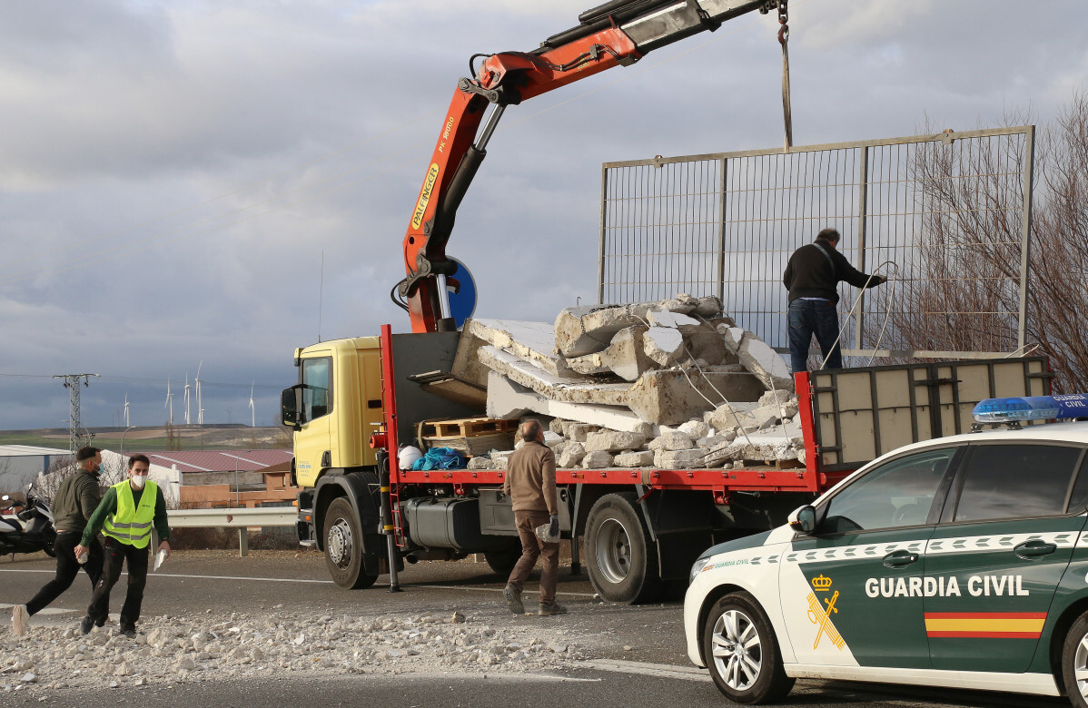 Al lugar se han desplazado dos patrullas de la Guardia Civil y trabajadores de conservación y mantenimiento de carreteras para señalizar la zona y garantizar la seguridad del resto de usuarios de la vía durante la retirada de la carga, que lo estaba realizando el propio camión implicado, dado que poseía una grúa.