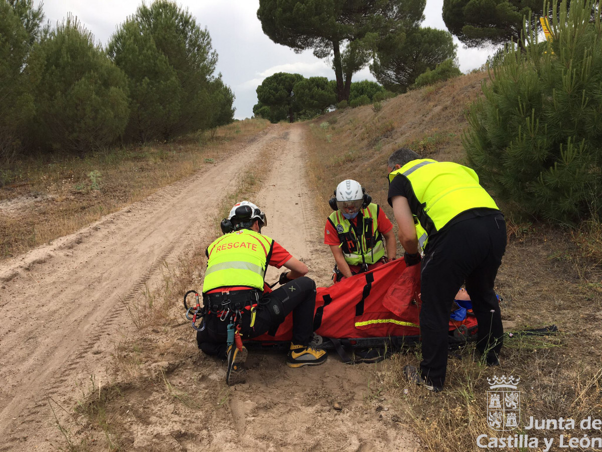 Finamente, el personal de rescate localiza al ciclista herido en una zona al oeste de La Parrilla y, tras aterrizar en una zona próxima, los rescatadores han descendido, y han accedido hasta el herido. Se le ha inmovilizado con un colchón de vacío, colocado en una camilla y trasladado, en helicóptero, al lugar donde espera el personal sanitario, que le atiende y le traslada en ambulancia de soporte vital básico al Hospital Río Hortega de Valladolid.