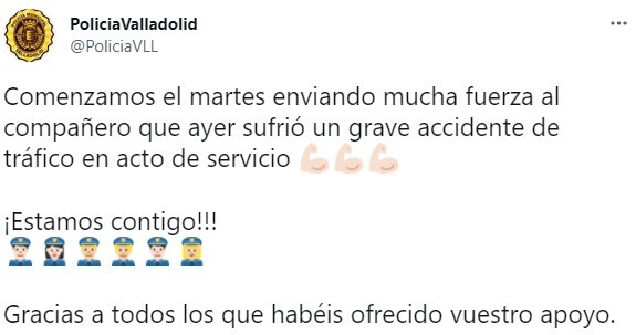 La Policía Municipal de Valladolid ha enviado esta mañana, a través de su cuenta de Twitter, un mensaje de apoyo al agente herido ayer cuando acudía al aviso de un tiroteo en el barrio de Pajarillos y que se saldó con un hombre herido por dos disparos de bala.