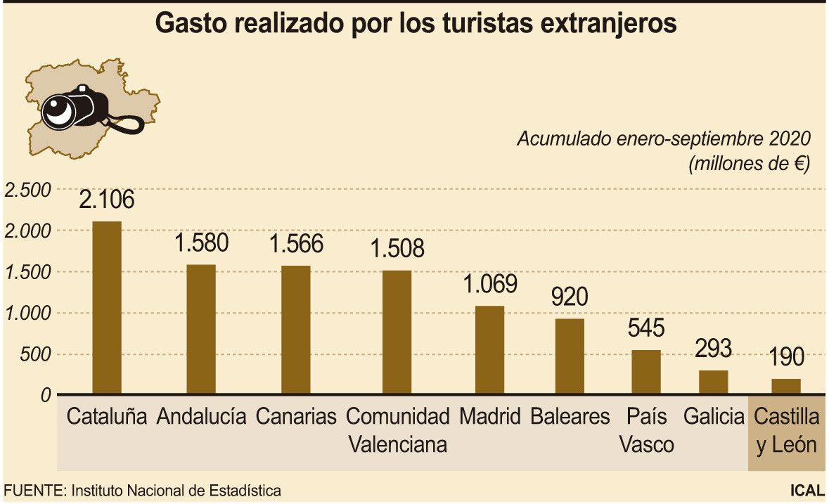 Los turistas internacionales gastaron en Castilla y León 188,6 millones de euros en los nueve primeros meses del año 2020, lo que supone un descenso del 62,1 por ciento respecto al mismo periodo del año anterior por la COVID-19, cuando en el conjunto nacional se contrajo un 73,4 por ciento.