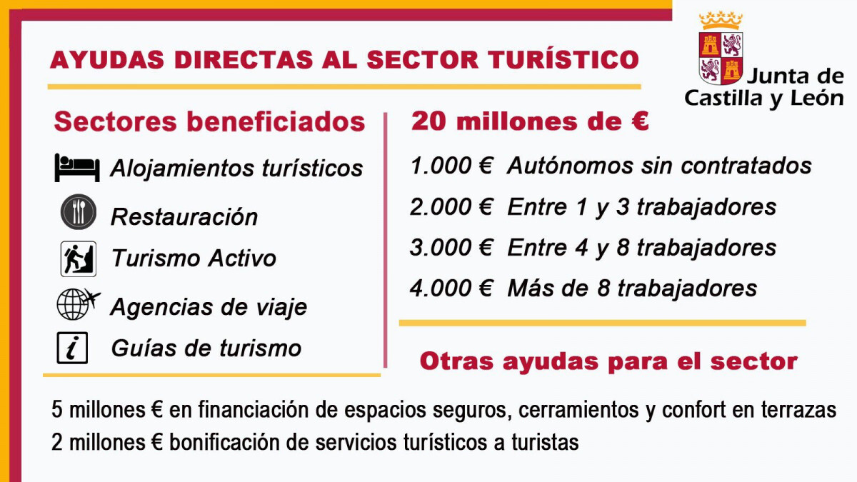 El Boletín Oficial de Castilla y León publica hoy la convocatoria de subvenciones directas destinadas a paliar la situación de pérdida económica sufrida por el sector turístico de Castilla y León, derivada de la crisis ocasionada por la COVID-19, con un importe de 20 millones de euros. Esta crisis ha generado un importante impacto en el sector turístico en Castilla y León, uno de los más importantes en la economía regional, como lo prueban los ingresos generados por los visitantes durante 2019, que ascendieron a más de 2.000 millones de euros, lo que supuso un incremento del 7,6 % respecto al mismo periodo del año 2018, o que en 2019 visitaran la Comunidad casi 9 millones de turistas, que generaron 15,5 millones de pernoctaciones.