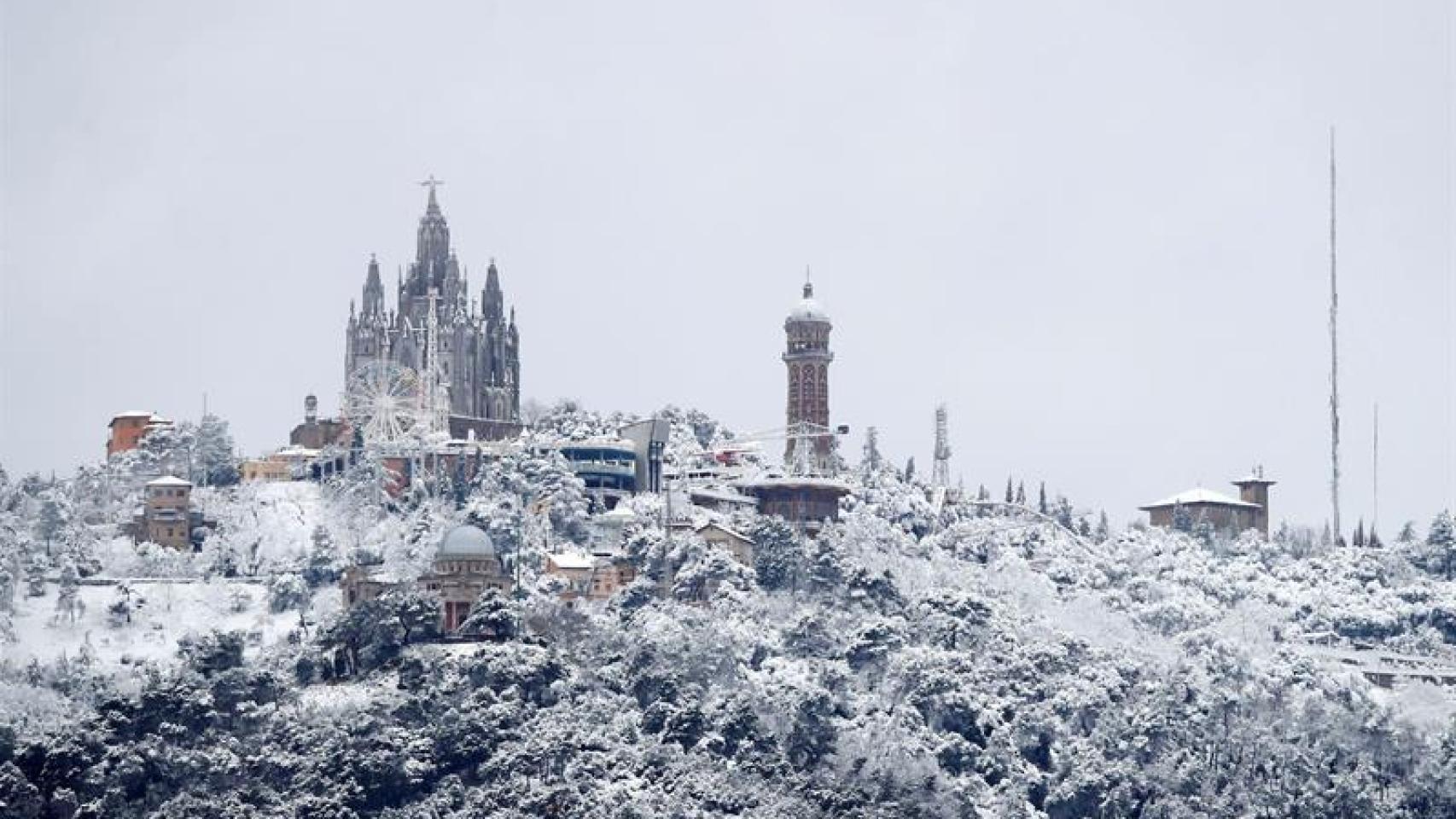 Vista de la montaña del Tibidabo vista desde Barcelona que hoy ha amanecido cubierto de nieve, en una jornada en la que la llegada de la primavera coincide con un frente que dejará nieve en cotas de hasta 400 metros y lluvia en el resto. EFE/Alberto Estévez