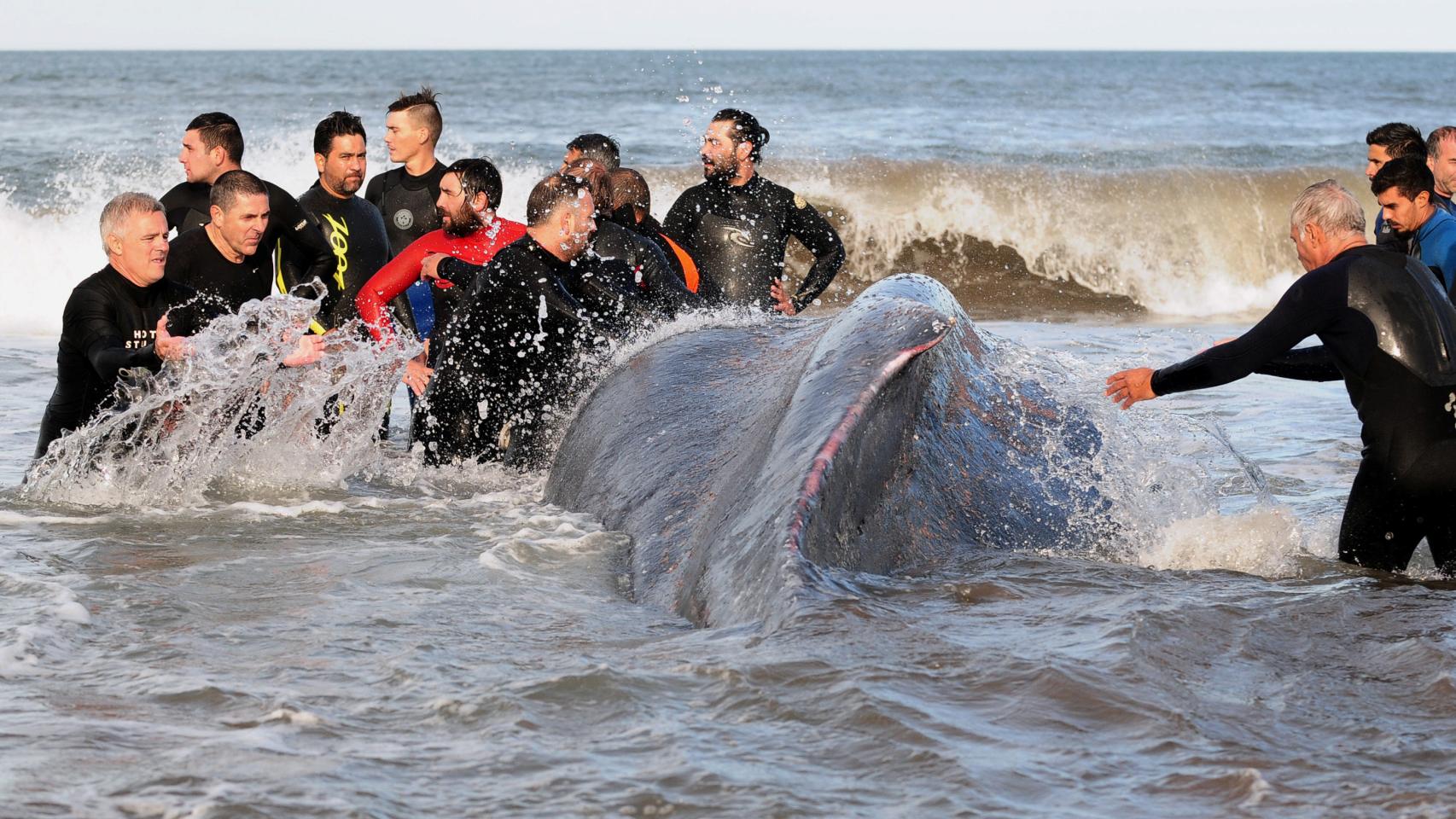 Todos a una. Voluntarios y miembros de la Guardia Costera trabajan para devolver al mar a una ballena jorobada en Punta Mogotes, Mar de Plata, Argentina. REUTERS/Stringer.