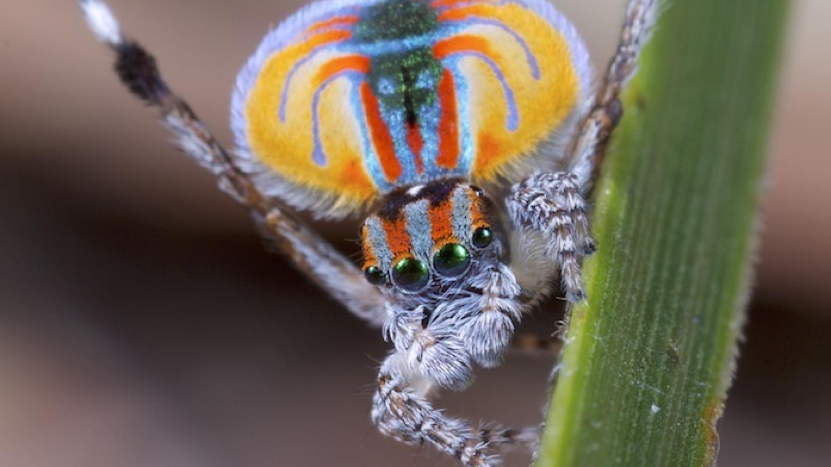 La minúscula Maratus volans recibe este nombre gracias a una parte de su cuerpo que tiene muchos colores diferentes y que utiliza para cortejar a las hembras, al igual que la famosa ave.