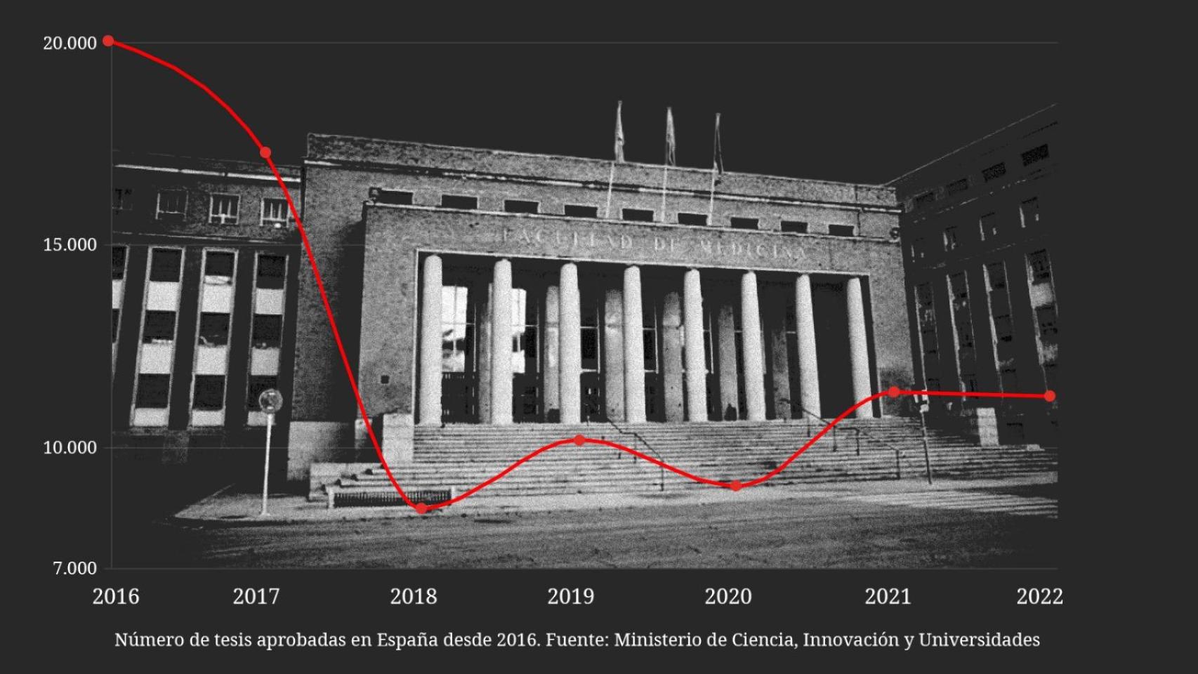 Realizar un doctorado es algo que requiere mucho tiempo y, sobre todo, trabajo. Es el máximo grado académico y, sobre todo, es necesario para aquellos que quieren dedicar su vida a la investigación académica. No obstante, la titulación no pasa por su mejor momento en España. Desde 2016 a 2022 —último año con datos oficiales— se ha reducido casi a la mitad la cantidad de tesis aprobadas cada año. En poco más de seis años pasaron de ser 20.049 a 11.259, casi un 44% de diferencia. También han descendido los matriculados en los dos últimos cursos y han pasado de 97.749 a 94.680. Se han perdido más de 3.000 alumnos.