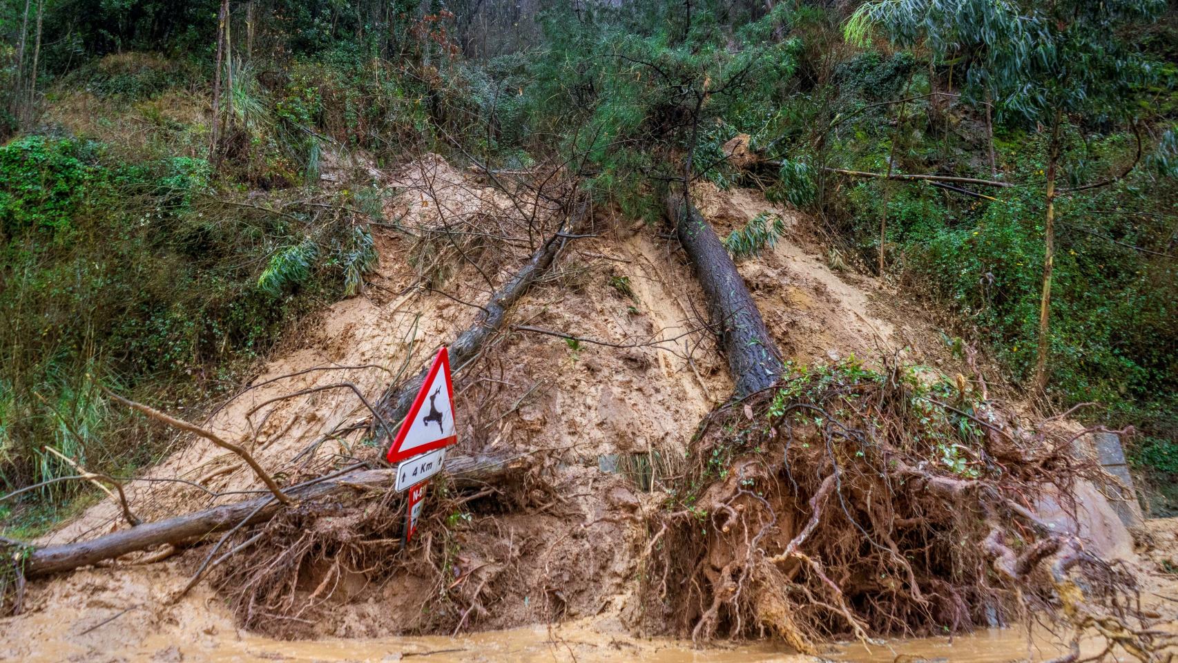 Vista de un desprendimiento en la carretera n-611 junto a la localidad de Los Corrales de Buelna. El Gobierno cántabro ha declarado el nivel uno del plan especial ante el riesgo de inundaciones, que están provocando "un panorama como quizá no se ha conocido nunca en Cantabria, una auténtica catástrofe", ha asegurado en una de las zonas afectadas el presidente Miguel Ángel Revilla.