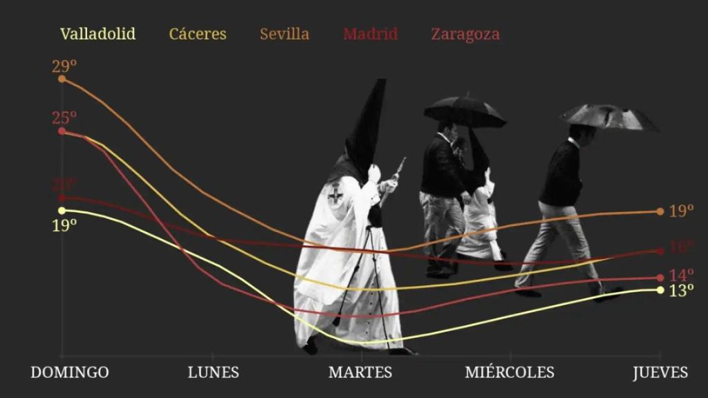 "Retrocedemos al invierno". Con esta inapelable contundencia se expresa Rubén Del Campo, portavoz de la Agencia Estatal de Meteorología (Aemet), para describir el temporal de frío, fuertes lluvias y nieve que marcará la Semana Santa de 2024. Aunque los comienzos de la primavera son una época de transición propicia para la inestabilidad meteorológica, el desplome "notable y generalizado" de 12 grados de temperatura máxima entre el domingo y el lunes convierte este episodio en algo excepcional.