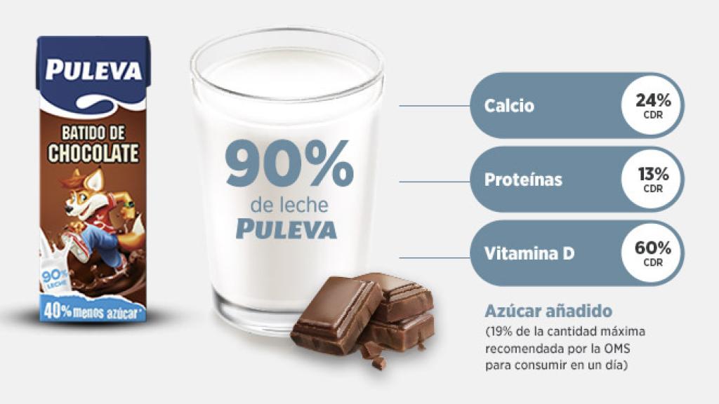 El 90% de un batido de chocolate como el de Puleva es leche, lo que se traduce en un elevado valor nutricional gracias al contenido de calcio, proteínas de alta calidad nutricional, fósforo y a que es fuente de vitaminas D, nutrientes que deben tenerse en consideración al evaluar su composición nutricional.