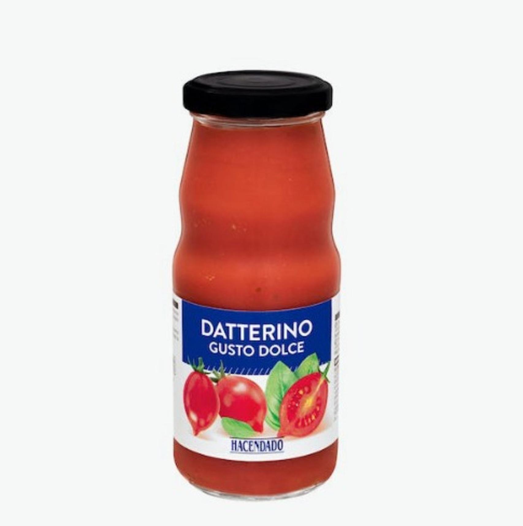 La Salsa de Tomate Datterino Hacendado Sabor Dulce guarda grandes similitudes con la famosa passata italiana, el puré de tomate concentrado que es más intenso que la salsa común gracias a su cocción y concentración. Es una receta que requiere que dejemos que se evapore el agua de los tomates troceados hasta que quede muy espeso, mezclando además aromáticas como la albahaca, pero con poco aceite de oliva y pasando la mezcla por el pasapuré para retirar pieles y semillas.